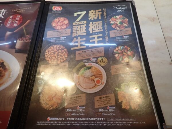 餃子の王将で「新極王7シリーズ」を食べてきました。 公開日:2026年2月6日 期間限定メニュー 餃子の王将で「新極王7シリーズ」の味噌汁を食べてきました。 餃子の王将です。 メニューです。 極王餃子の王将ラーメンです。 極王酢豚/ジャストサイズです。 極王回鍋肉/ジャストサイズです。 極王海老のチリソース/ジャストサイズです。 極王天津炒飯/ジャストサイズです。 極王麻婆豆腐/ジャストサイズです。 極王鶏の唐揚/ジャストサイズです。 餃子の王将 面白いと思った方は、クリックして、応援してね! タグ 期間限定 餃子の王将 関連記事 ロイヤルホストで期間限定「牡蠣と蟹の和風ピラフ&海老と帆立のあつあつグリル」を食べてきました!焼肉ライクで「お肉50%増量」キャンペーンを食べてきました!焼肉ライクで期間限定「肉の日」キャンペーンを食べてきました!なか卯で期間限定「天然いくら丼(豪快盛)」を食べてきました!大戸屋で期間限定「生さんま炭火焼き」と「なめこ汁」を食べてきました!大戸屋で期間限定「大粒牡蠣フライ6個」と「なめこ汁」を食べてきました! 投稿ナビゲーション 松屋で期間限定「鶏のどて煮風鍋」を食べてきました!