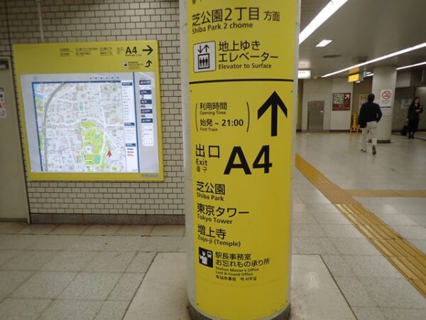 都営三田線・芝公園駅の出口A4に地図があるので東京タワーまで道のりを確認します。