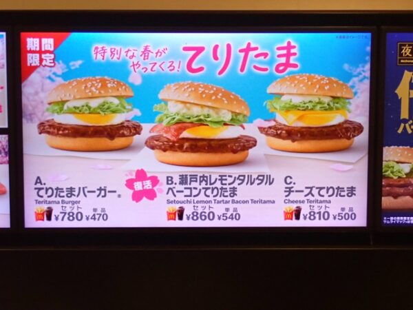 マクドナルドで期間限定「瀬戸内レモンタルタルベーコンてりたま」を食べてきました! 公開日:2026年3月13日 期間限定メニュー マクドナルドで期間限定「瀬戸内レモンタルタルベーコンてりたま」を食べてきました。 マクドナルドです。 メニューです。 瀬戸内レモンタルタルベーコンてりたまとコーラーとポテトのセットです。 マクドナルド 面白いと思った方は、クリックして、応援してね! タグ 期間限定 マクドナルド 関連記事 焼肉ライクで期間限定「肉の日」キャンペーンを食べてきました!すき家で期間限定「【お肉2倍】すき焼き定食(たまご2個)」を食べてきました!なか卯で期間限定「うに丼」を食べてきました!なか卯で期間限定「天然いくら丼(豪快盛)」を食べてきました!なか卯で年越しそばとして期間限定「鴨そば(大盛)」を食べてきました!ロイヤルホストで期間限定「いくらと時鮭、蟹のご飯&真鱈と牡蠣のあつあつグリル」を食べてきました! 投稿ナビゲーション やよい軒で期間限定「【お肉2倍】牛焼きしゃぶ定食(特製味噌だれ/辛子味噌)」を食べてきました!