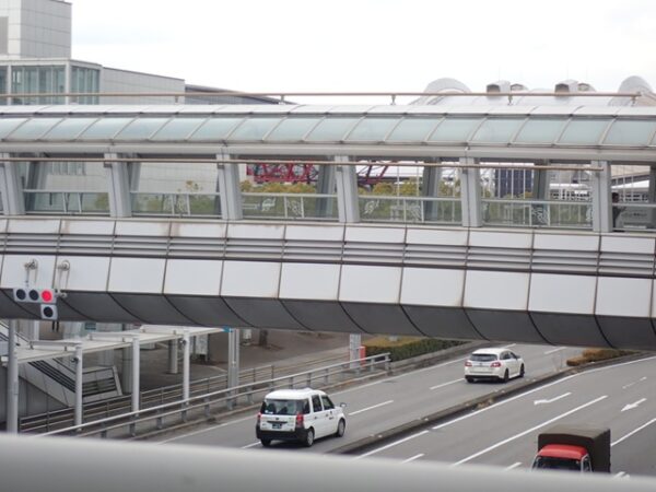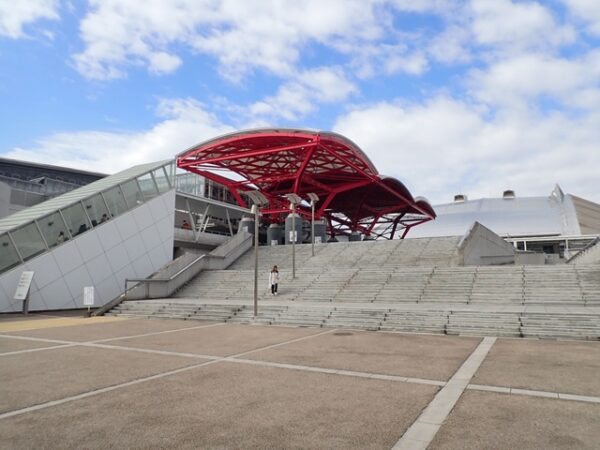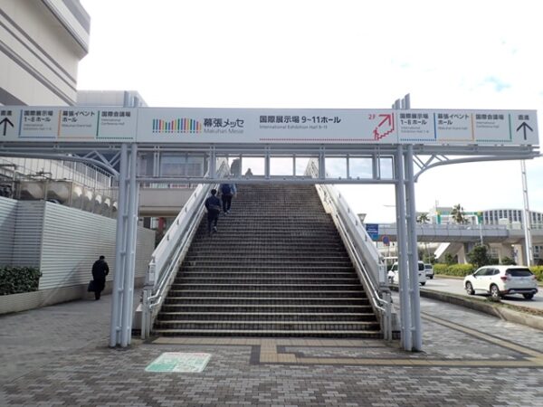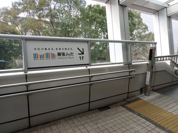階段を上がると遠くに赤い幕張メッセが見えます。