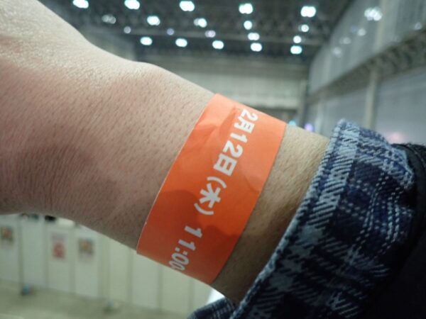 リストバンドのテープをはがして、手首にリストバンドを付けます。