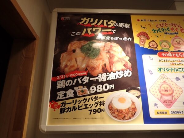 松屋で期間限定「鶏のバター醤油炒め定食」を食べてきました! 公開日:2026年4月3日 期間限定メニュー 松屋で期間限定「鶏のバター醤油炒め定食」を豚汁に変更して、富士山キムチを追加して、食べてきました。 松屋です。 松屋で期間限定「鶏のバター醤油炒め定食」を豚汁に変更して、富士山キムチを追加しました。 松屋 面白いと思った方は、クリックして、応援してね! タグ 期間限定 松屋 関連記事 なか卯で期間限定「山かけ天然本まぐろ丼(並盛)」を食べてきました!なか卯で期間限定「うに丼」を食べてきました!大戸屋で期間限定「生ニラだれの油淋鶏」と「なめこ汁」を食べてきました!すき家で期間限定「いくらまぐろたたき丼」を食べてきました!やよい軒で期間限定「【お肉2倍】すき焼き定食」を食べてきました!洋麺屋五右衛門で期間限定「具だくさん!!カニと帆立と4種きのこのペペロンチーノ」を食べてきました! 投稿ナビゲーション 松屋で期間限定「創業ビーフ牛タンカレー」を食べてきました!