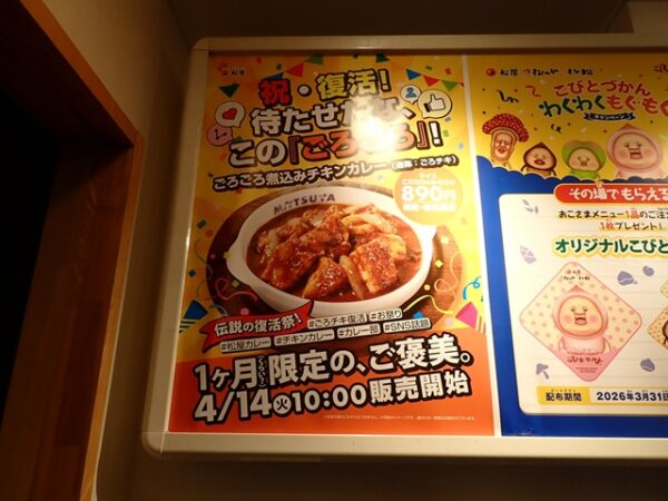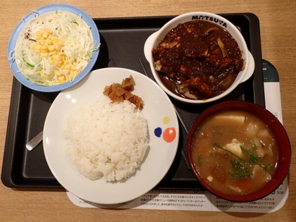 松屋で期間限定「ごろごろ煮込みチキンカレー(大盛)」を食べてきました! 公開日:2026年4月19日 期間限定メニュー 松屋で期間限定「ごろごろ煮込みチキンカレー(大盛)」の味噌汁を豚汁に変更し、生野菜と追加して食べてきました。 松屋です。 「ごろごろ煮込みチキンカレー(大盛)」の味噌汁を豚汁に変更し、生野菜と追加しました。 松屋 面白いと思った方は、クリックして、応援してね! 関連記事 洋麺屋五右衛門で期間限定「広島産牡蠣と海老とブロッコリーのペペロンチーノ(大盛)」を食べてきました!なか卯で年越しそばとして期間限定「鴨そば(大盛)」を食べてきました!松屋で期間限定「鶏のどて煮風鍋」を食べてきました!マクドナルドで期間限定「瀬戸内レモンタルタルベーコンてりたま」を食べてきました!すき家で期間限定「ローストビーフ丼」を食べてきました!なか卯で期間限定「うに丼」を食べてきました! 投稿ナビゲーション なか卯で期間限定「ねぎ塩まぐろたたき丼」を食べてきました!