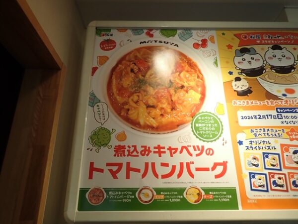 松屋で期間限定「煮込みキャベツのエッグトマトハンバーグ定食」を食べてきました! 公開日:2026年3月18日 期間限定メニュー 松屋で期間限定「煮込みキャベツのエッグトマトハンバーグ定食」の味噌汁を豚汁に変更して、食べてきました。 松屋です。 煮込みキャベツのエッグトマトハンバーグ定食の味噌汁を豚汁に変更しました。 松屋 面白いと思った方は、クリックして、応援してね! タグ 期間限定 松屋 関連記事 なか卯で期間限定「うに丼」を食べてきました!松屋で期間限定の「炙りサーモンいくら丼(大盛)」を食べてきました!松屋で期間限定「鶏のどて煮風鍋」を食べてきました!天丼てんやで期間限定「海老と4種の北海道産天丼」を食べてきました!松屋で期間限定「ちいかわのすき焼き鍋膳」を食べてきました!マクドナルドで期間限定「瀬戸内レモンタルタルベーコンてりたま」を食べてきました! 投稿ナビゲーション すき家で期間限定「おんたまほうれん草ほろほろチキンカレー」を食べてきました!