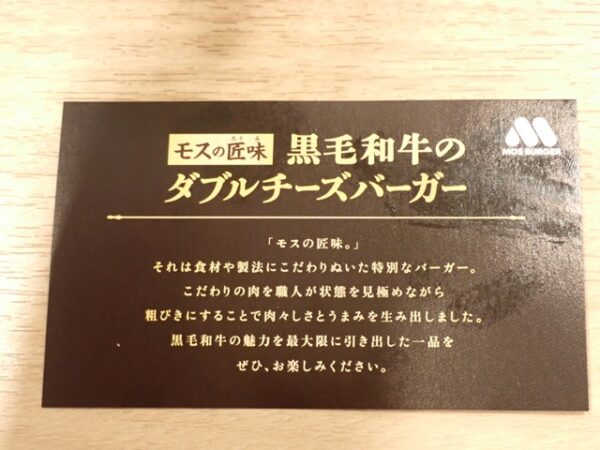 モスバーガーで「黒毛和牛のダブルチーズバーガー」を食べてきました! 公開日:2025年12月17日 期間限定メニュー モスバーガーで「黒毛和牛のダブルチーズバーガー」を食べてきました。 モスバーガーです。 黒毛和牛のダブルチーズバーガー、モスバーガー、フレンチフライポテト&オニオンフライとペプシコーラ(L)です。 黒毛和牛のダブルチーズバーガーは、カロリー高めで満足感があります。 モスバーガーは、軽いと感じました。 説明書が付いていました。 モスバーガー 面白いと思った方は、クリックして、応援してね! タグ 期間限定 モスバーガー 関連記事 洋麺屋五右衛門で期間限定「具だくさん!!カニと帆立と4種きのこのペペロンチーノ」を食べてきました!大戸屋で期間限定「生ニラだれの油淋鶏」と「なめこ汁」を食べてきました!カレーハウスCoCo壱番屋「ローストチキンスープカレー」を食べてきました!なか卯で期間限定「天然いくら丼(豪快盛)」を食べてきました!シュークリーム専門店 ビアードパパ の秋限定のシュークリームを食べてきました!焼肉ライクで11月29日の「常陸牛」を食べてきました! 投稿ナビゲーション すき家で期間限定「【お肉2倍】すき焼き定食(たまご2個)」を食べてきました!