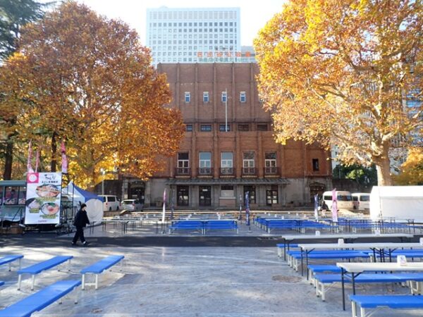 日比谷公会堂の前にイスとテーブルが並べられています。